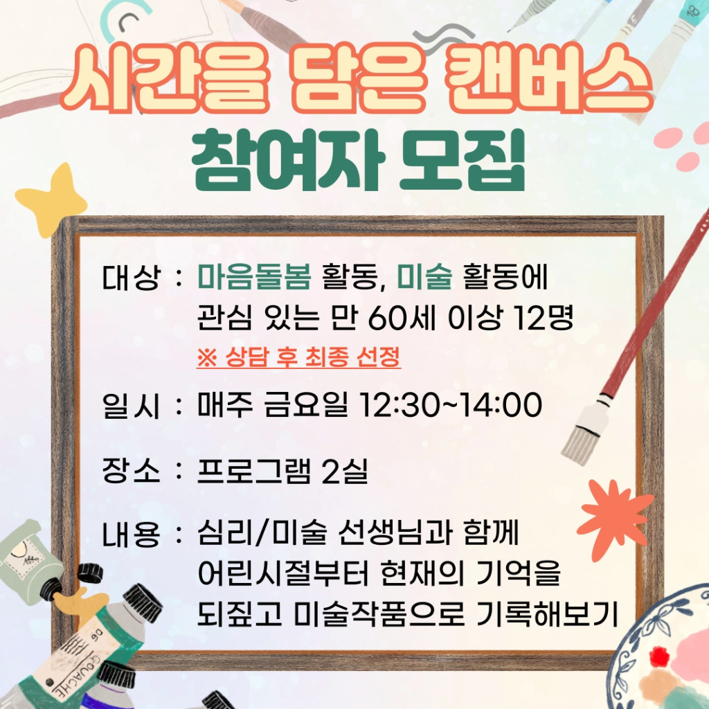 [2026년 '시간을 담은 캔버스' 참여자 모집]살아온 시간을 캔버스 속 미술 작품으로 남겨보는 미술프로그램!'시간을 담은 캔버스' 참여자를 모집...