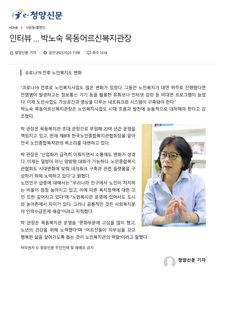 [청양신문] 인터뷰 … 박노숙 목동어르신복지관장