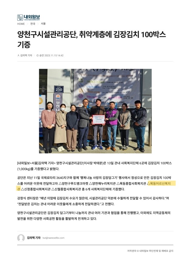 양천구시설관리공단, 취약계층에 김장김치 100박스 기증