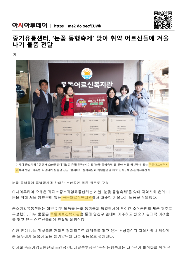 중기유통센터, '눈꽃 동행축제' 맞아 취약 어르신들에 겨울나기 물품 전달