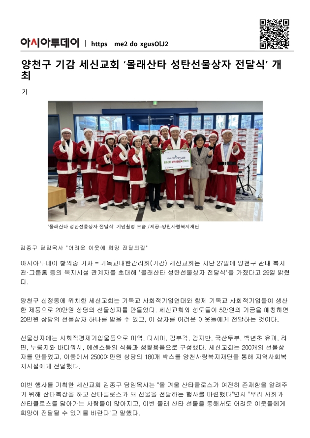 양천구 기감 세신교회 '몰래산타 성탄선물상자 전달식' 개최
