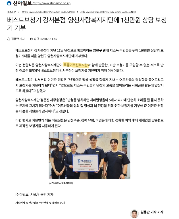 베스트보청기 강서본점, 양천사랑복지재단에 1천만원 상당 보청기 기부