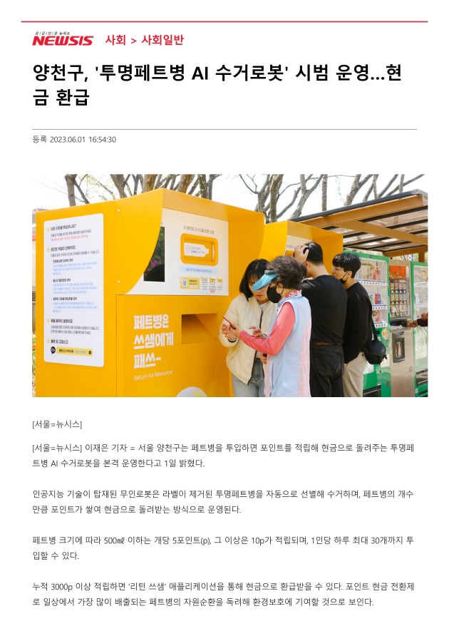 양천구, '투명페트병 AI 수거로봇' 시범 운영···현금 환급