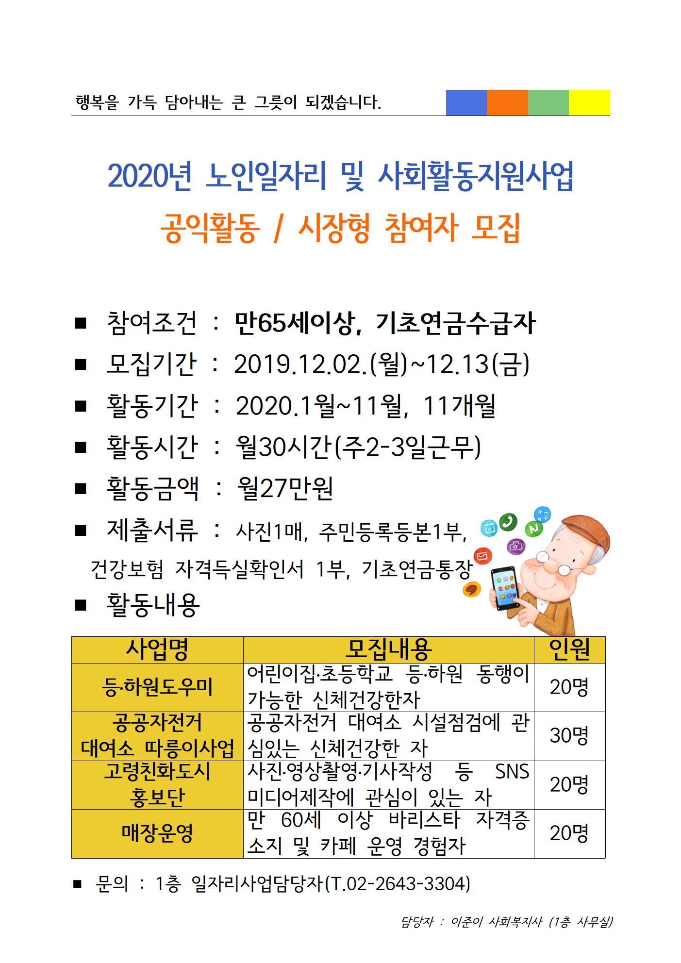 2020년 노인일자리 및 사회활동지원사업 공익활동/시장형 참여자 모집